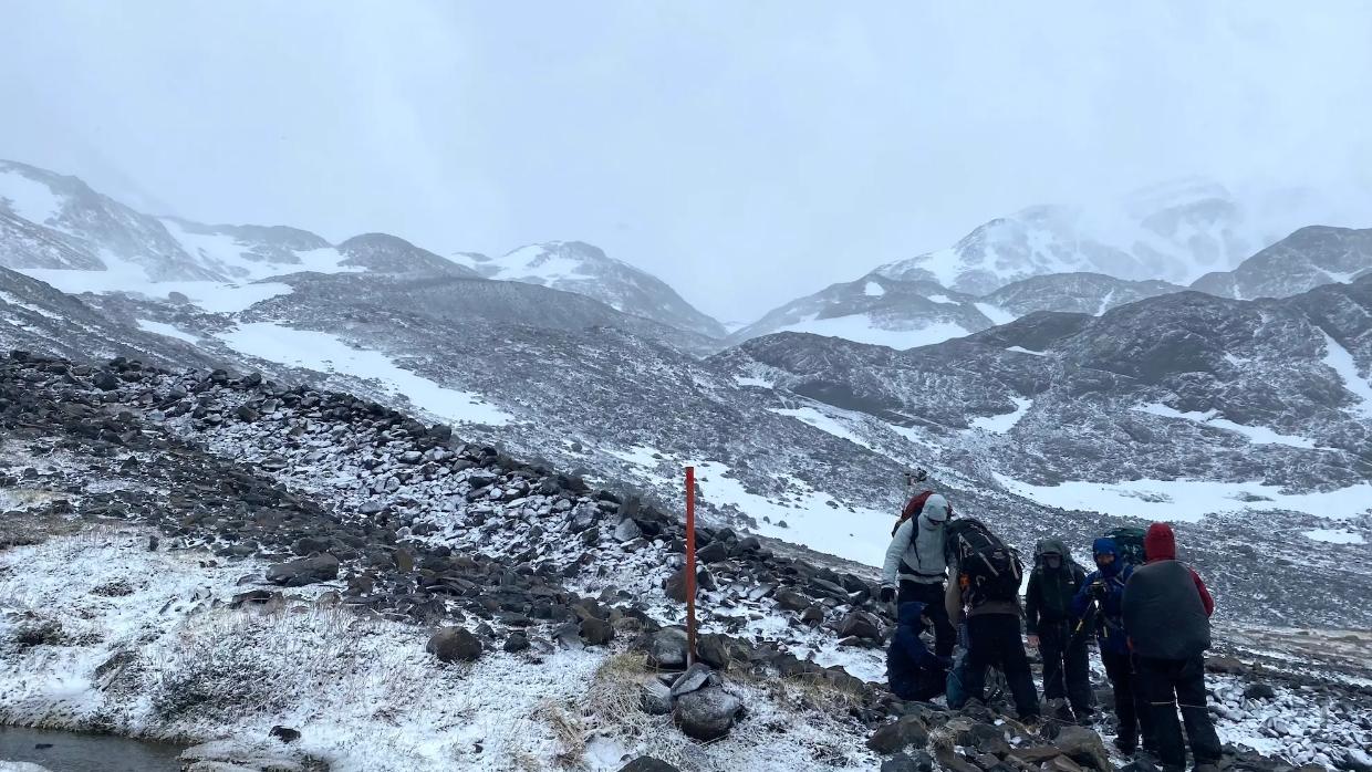 After reaching the tree line, the terrain became fully exposed. Wind pushed hikers laterally across the trail. Snow began accumulating on the ground and trail markers became increasingly difficult to identify.